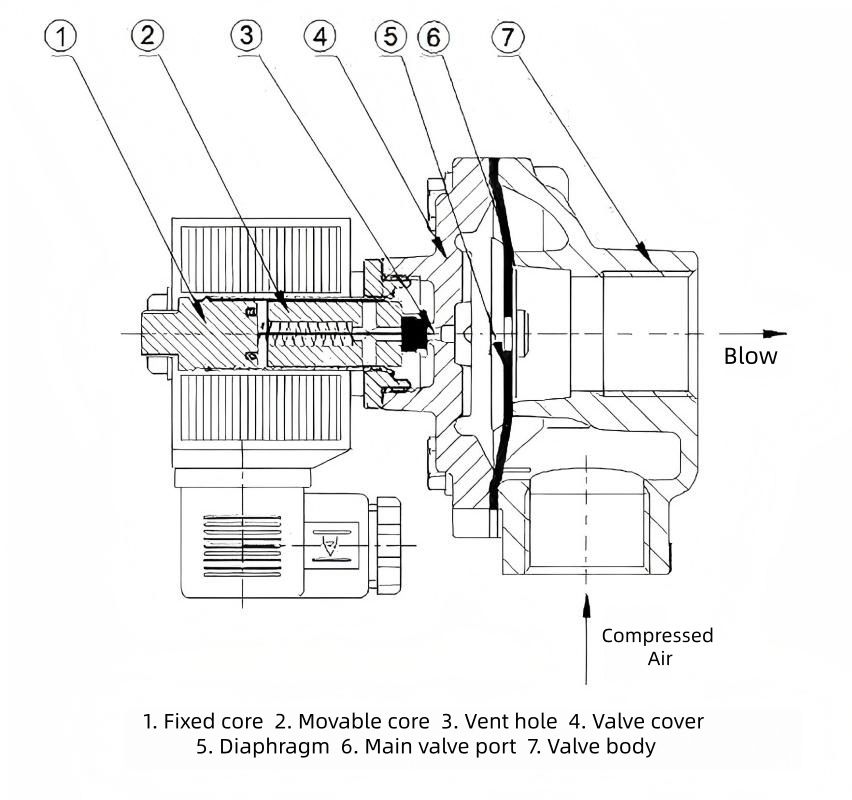 Diafraqmanın işə salınması: Pnevmatik təzyiq fərqi ilə idarə olunur. Enerji verildikdə, solenoid başlığı arxa kameranın təzyiqini boşaltmaq üçün relyef portunu açır və bu, ön kamera qazının geri zərbə üçün diafraqmanı qaldırmasına imkan verir. Enerji kəsildikdən sonra yay möhürlənmiş vəziyyəti bərpa edərək deşiyi bağlamaq üçün sıfırlanır.